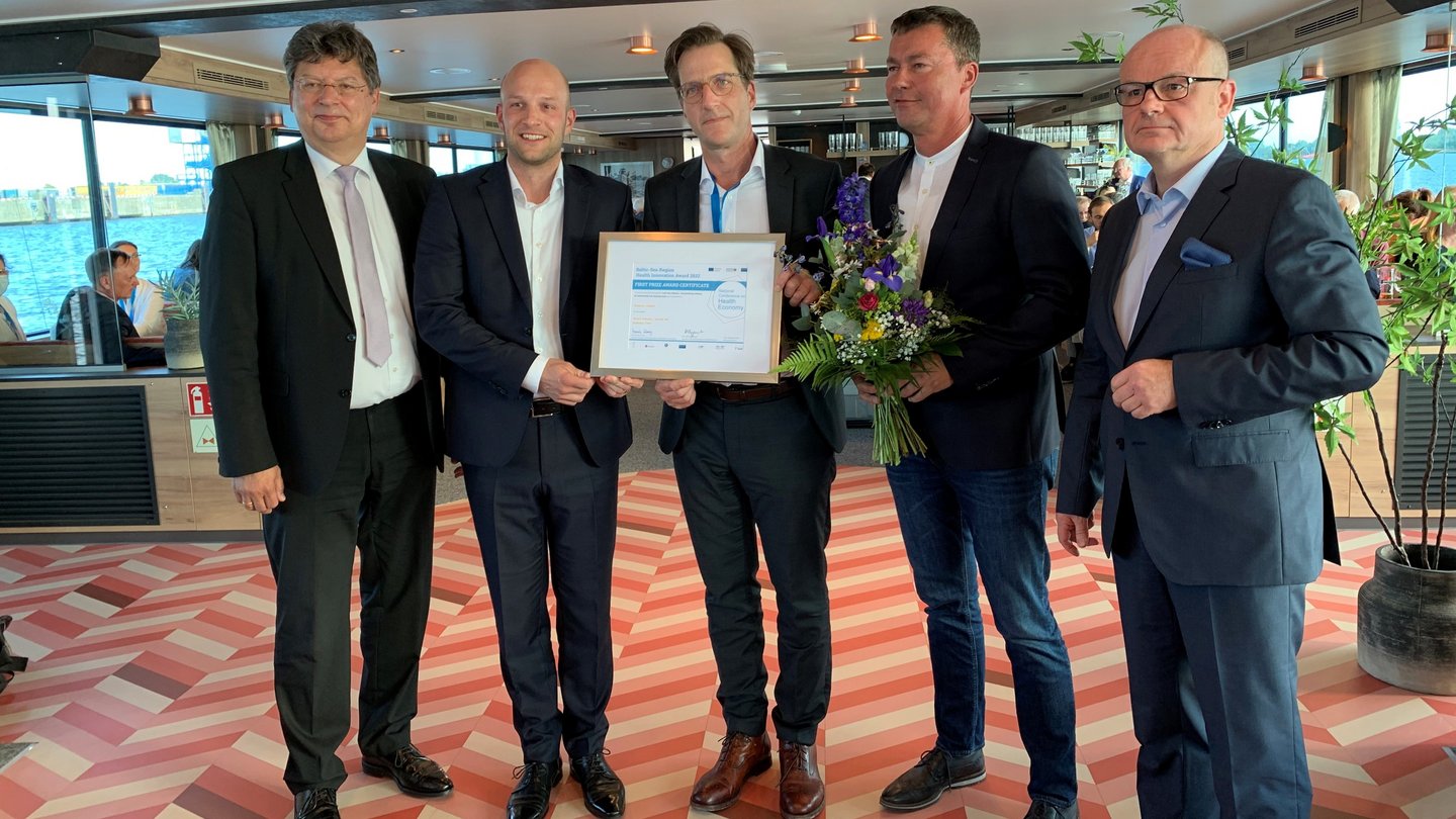 Im vergangenen Jahr ist die Neubrandenburger Firma Osentec GmbH für ihre intelligente Schuhsohle mit dem "Baltic-Sea-Region Health Innovation Award" ausgezeichnet worden. (Von links: Minister Reinhard Meyer, Lars Eschenburg, Dr. med. Alexander Kaminski, Frank Starkowski und Prof. Dr. Marek Zygmunt)